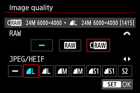 CRAW files are about 40% smaller than uncompressed RAW, but other than that, there is no visible difference. They both have the same .cr3 extension. Choose CRAW to fit more shots on your memory card.