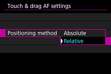 “Absolute”: Tap something on the monitor to move the AF frame to that location.