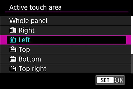 This menu sets the part of the rear monitor that is sensitive to touch & drag gestures. We recommend setting the active touch area on the same side as your dominant viewfinder eye—it keeps your nose out of the way!