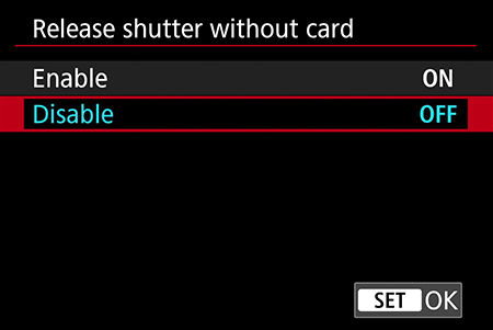 Some cameras will show a “No card in camera” warning when you turn them on, but you can take it a step further by stopping your camera from shooting at all. How: Go to the red menu and disable the default “Release shutter without card” feature.