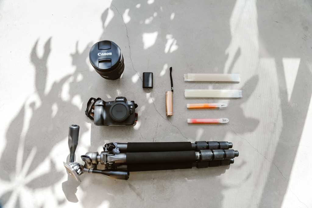 The tools needed for light painting are simple: a camera, tripod, light sticks and a torch light. For this shoot, we are using Canon’s first full frame mirrorless camera, the EOS R, which captures amazing photos even under low-light conditions. The camera boasts a low-light autofocus of EV-6, enabling one to focus effortlessly on a subject even in the dark. Equipped your camera with a memory card and battery (pack extra if you intend to shoot all night), as well as torches and light sticks with a variety of colours.
