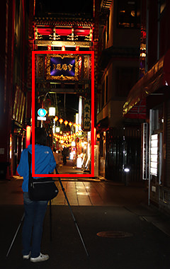 After sunset, the sky becomes very dark. Avoid having the dark sky occupy a large part of the composition, as doing so can cause the colourful atmosphere of the night view to be compromised. An effective method in this case is to change the aspect ratio. For a horizontally-oriented image, selecting [16:9] crops away a part of the indistinct sky at the top and the dark ground at the bottom. The top and bottom parts are masked on the Live View image, allowing you to check the composition before taking a shot.