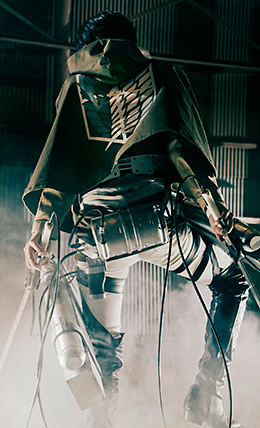 Here, I expressed the characteristics of Captain Levi in the famous anime, "Attack on Titan." I chose a back shot to bring out his forcefulness. As the costume and gadgets are eye-catching, I adjusted the lighting carefully to avoid them from standing out too excessively. Also, I wanted to portray the sense of tension as he makes his way to the battlefield, so I created smoke in the small studio to add depth to the photo. Taken at ISO 1600, noise is almost non-existent in the image.