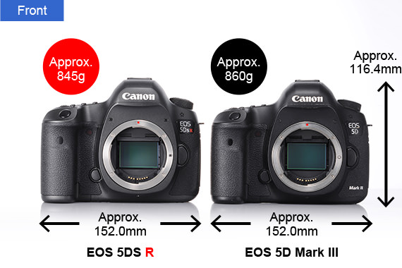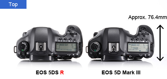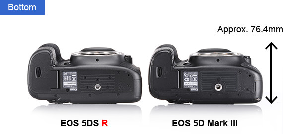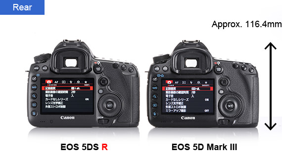 Both the EOS 5DS R and the EOS 5D Mark II have the same external dimensions in front as well as on the rear. However, the new model is slightly lighter due to the different internal structure. More specifically, in addition to the protrusion at the right edge of the body of the EOS 5DS R, the only difference between them is the colour of the emblem. Also, the EOS 5DS R is applied with a layer of highly durable coating to minimise any change in the texture due to long-term use of the camera.