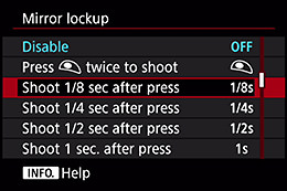 Unlike conventional models, the shutter time lag after the mirror is locked up can be set manually. By selecting an interval setting, both the mirror lockup and shutter release operations can be performed successively with a single press of the shutter button, thus helping to reduce camera shake.