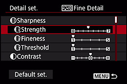 Two parameters have been newly added to the Sharpness setting to enable more detailed adjustment of the apparent resolution. Both [Fineness] and [Threshold] are similar to the items on the DPP for RAW development, and they can be used to specify where you want to sharpen and how wide you want the sharpening effect to be applied.