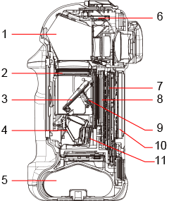 An illustration of the inner construction of the EOS-1D X. The main mirror inside the large mirror box is required to move high-speed and accurately to realize the approx. 12fps continuous shooting speed.