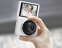 Turn the free-angle LCD monitor 180° for it to face you. Press the 360° shutter ring down halfway to set the focus, followed by pressing it down fully to release the shutter.