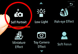 Select "Self Portrait" from the menu shown in the LCD monitor. Other shooting modes available are "Hybrid Auto", "Auto", "Program AE", "Low Light", "Fish-eye Effect", "Miniature Effect", "Toy Camera Effect", "Soft Focus", and "Monochrome".