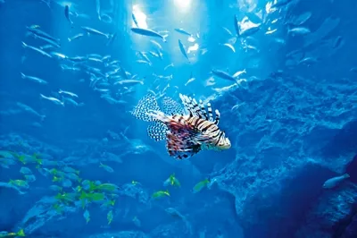 A jellyfish tank. The blue light that brightens the entire water tank, together with light that enters the water from above, adds a fantastical feel to the jellyfish.