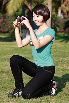 Squat down with one knee to the ground to lower your body's center of gravity and obtain a stable shooting posture. While you are adjusting the shooting angle, tilt the camera without changing the posture of your upper body.