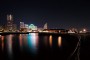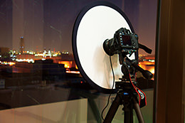 When shooting an external nightscape from an indoor location, a blackout curtain should be used to prevent the background reflection of the lights in the room. On this occasion, I used a reflector board with a hole that can be secured to the lens as shown in the photo. As the subject background is dark, casting a dark reflection on the window with the black side of the board eliminates the background reflections of the lights in the room.