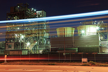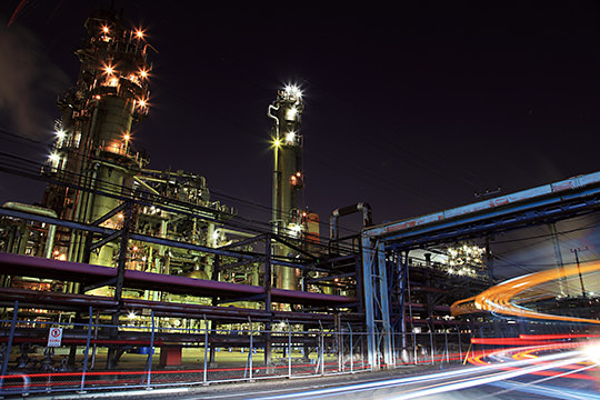 When the light trails located a distance above the ground are superimposed as shown in the photo, the factory can no longer be seen clearly. Hence, think of a composition in which the light traces will serve to enhance the factory nightscape.