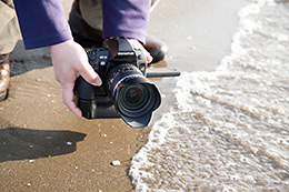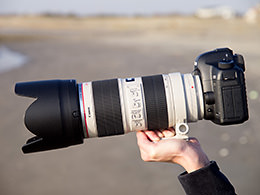 This is an example when Live View shooting is carried out at an extremely low angle that is almost touching the water surface. It would be difficult to press the shutter button from such a position under normal circumstances. However, with a battery grip attached, you can do so easily by pressing the shutter button located on it using your index finger while holding the camera with both hands and stretching them all the way toward the ground.
