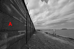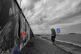 The blue colours of the different elements, namely the sea, sky, wall, and human subject, blend well in the image as though there had been some kind of chemical reaction. This effect helps to draw the viewer's attention toward the point of convergence at the centre of the image.
