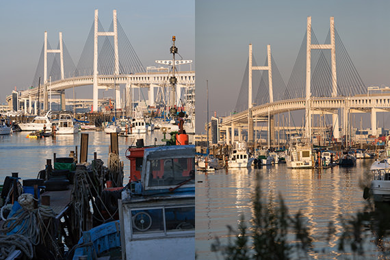 To create light-dark contrast in this scene, I purposely chose a time of day when the port in the foreground was shaded. Doing so creates a visual effect that allows the main subject, which is the suspension bridge, to stand out in relief.