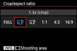 Full-frame, 1.3x crop, 1.6x crop, 1:1 (aspect ratio), 4:3 (aspect ratio), 16:9 (aspect ratio)