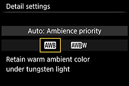 Scene detection ability is further enhanced on the EOS 5DS and EOS 5DS R. [Auto (Ambience priority)] and [Auto (White priority)] are newly added to the AWB menu. In the [Auto (White priority)] setting, influences from light source colours, such as that of tungsten light, are eliminated to enable reproduction of white colour in white.