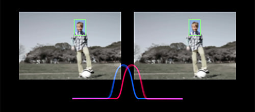 Miyanari All the pixels that are built into the image sensor of the EOS 70D are equipped with both the functions of phase-difference AF and imaging. However, the applicable area of the Dual Pixel CMOS AF is within about 80% of the image sensor area. In the diagram, red and blue colors are used to differentiate the two photodiodes inside a pixel, but they are not colored in real life. As with the AF sensor used for viewfinder shooting, the two "colored" photodiodes read out the amount of difference in the AF signals, which is equivalent to the amount of defocus in the subject. Based on this difference, the amount of lens drive is calculated for focusing to be performed. Also, the function of the conventional imaging pixel is now fulfilled by combining the signals from the two photodiodes.