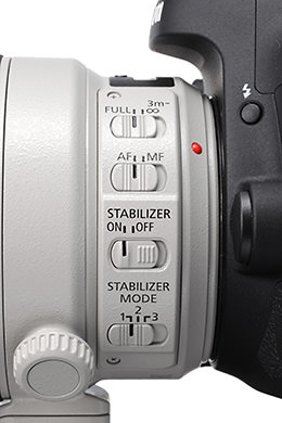 The functions are the same as that in new generation EF telephoto lens. For example, a new [MODE 3] has been installed in the IS. In MODE 3, the optical correction system is electrically locked when the shutter is partially depressed and the IS only works when exposed. When tracking a fast-moving subject, there is no image backlash particular to the IS and thus the subject can be framed more accurately.