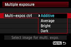 The effects of Multiple exposure function of the EOS 5D Mark III can be selected from four options which are [Additive], [Average], [Bright], and [Dark].