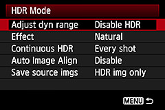 The HDR function combines three images with different exposure levels inside the camera to obtain a wider dynamic range. You can select from 5 options from the menu screen on the EOS 5D Mark III.
