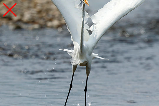 While I was trying to capture a great egret aiming at its food, it suddenly took off. I pressed the shutter button reflexively, but the face and wings of the subject were, unfortunately, outside the frame. Although the exposure and shutter speed were appropriate, the composition, which is a crucial element, left much to be desired. When capturing the moment a bird takes flight, it is necessary to create space in the direction the bird is moving in order to obtain a stable composition.