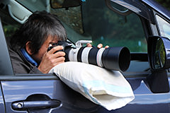 Wild birds flee at the sight of human beings. So how do we get close to them? The answer is to conceal your human form from them. For example, you could use your car as a moving blind. However, using a tripod in a car can be rather unstable. When taking a shot from the car window, you could make use of a bean bag as a cushion for the camera, as the photo illustrates This helps to produce stable images, and is a common technique in wild bird photography.