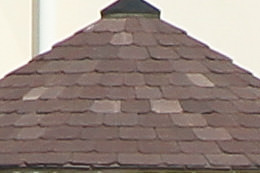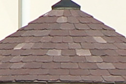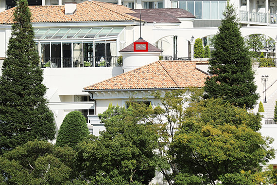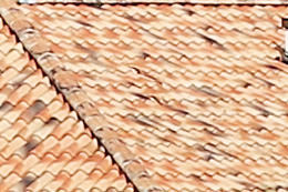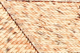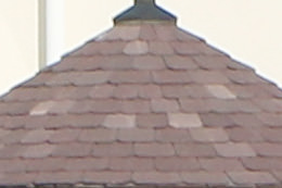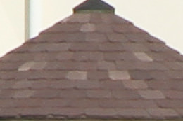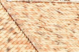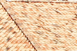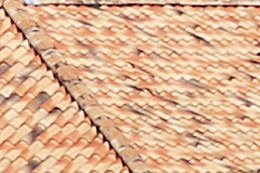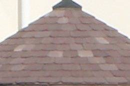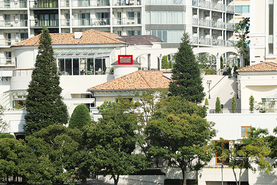At 70 mm, the depiction of the tiles and trees is reproduced in greater detail on the EOS 7D Mark II. At 200 mm, the difference in the depiction is not as perceptible.