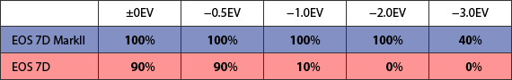 The EOS 7D Mark II’s low-light ranging limit is −3.0EV (f/2.8 sensor) for the central AF point, surpassing the values of −0.5EV on the EOS 7D and −2.0EV on the EOS-1D X. The peripheral AF points can also adapt to a brightness of −0.5EV. This figure is also higher than that on the EOS 7D. When a test was conducted, the EOS 7D Mark II, as expected, came out strong when shooting in dark areas, achieving a perfect focus up till −2.0EV. It is difficult to make out a subject even with the naked eye at a brightness of -3.0EV but the EOS 7D Mark II’s AF managed to work well in such a condition. However, in order to draw out this performance, it is necessary to use the f/2.8 cross-type sensor. Therefore a lens brighter than f/2.8 needs to be used. The obvious differences between the two cameras clearly demonstrates the capabilities of the new AF sensor.