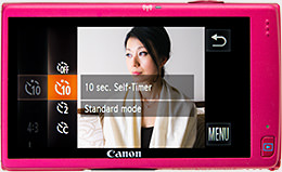 Tap on [FUNC.] on the LCD monitor, followed by the [10 sec. Self-Timer] option. Pressing the shutter button in this state releases the shutter after 10 seconds. Take a pose during this interval.