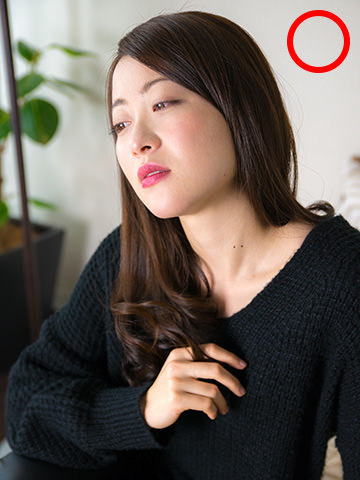 In a selfie shot, the most important facial part is none other than the "eyes." Adding expression to the eyes enhances the charm of the resulting photo. While a shot with big, bright eyes and a broad smile makes you appear lovely, it would be good too to exude the charm of a matured lady every now and then. To help you do so in a selfie, try a "downcast look" with your eyes looking down, which gives the impression as if you were lost in a thought. When photographing this "downcast look," a key point is to look away from the camera.