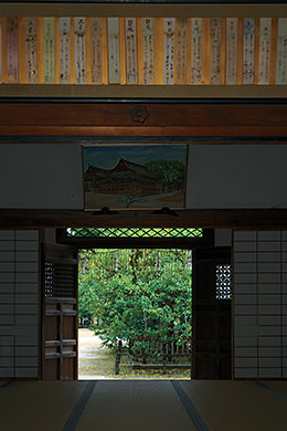 At Kitano Tenmangu Shrine, Kyoto. The photo captures both the picture frame above the entrance as well as the shrine grounds.
