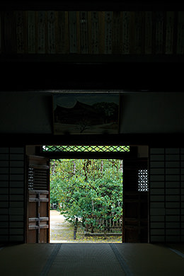 The distance to the frame was about three metres while to the shrine grounds it was around eight metres. With the aperture value set to f/16, focus was established on both. The exposure level for the landscape was then decided based on the aperture value. The flash was set manually to an output of 1/8 and fired upward.