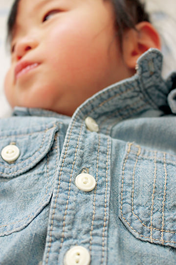 This shot was taken with the focus set on the shirt buttons. Recording objects such as the clothes worn helps to bring more pleasure when you look back on the photos.