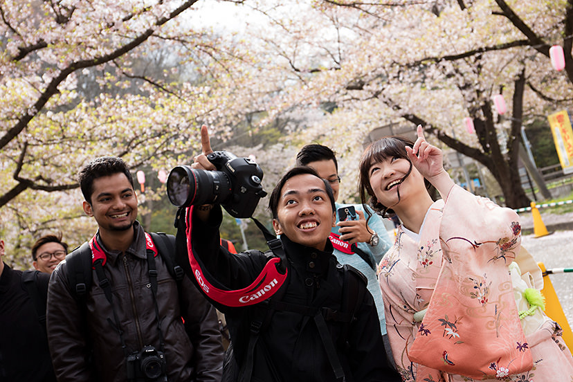 When the participants photographed their human subjects under the cherry blossom trees and wanted to increase their variety of shots, they asked me technical questions like, “Which angle should I photograph Aki-san from in this spot? What kind of lens and aperture should I use?” My suggestions were to create foreground blur by shooting from a low angle, and to use lens with a longer focal length so there was not too much distortion.