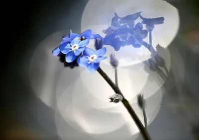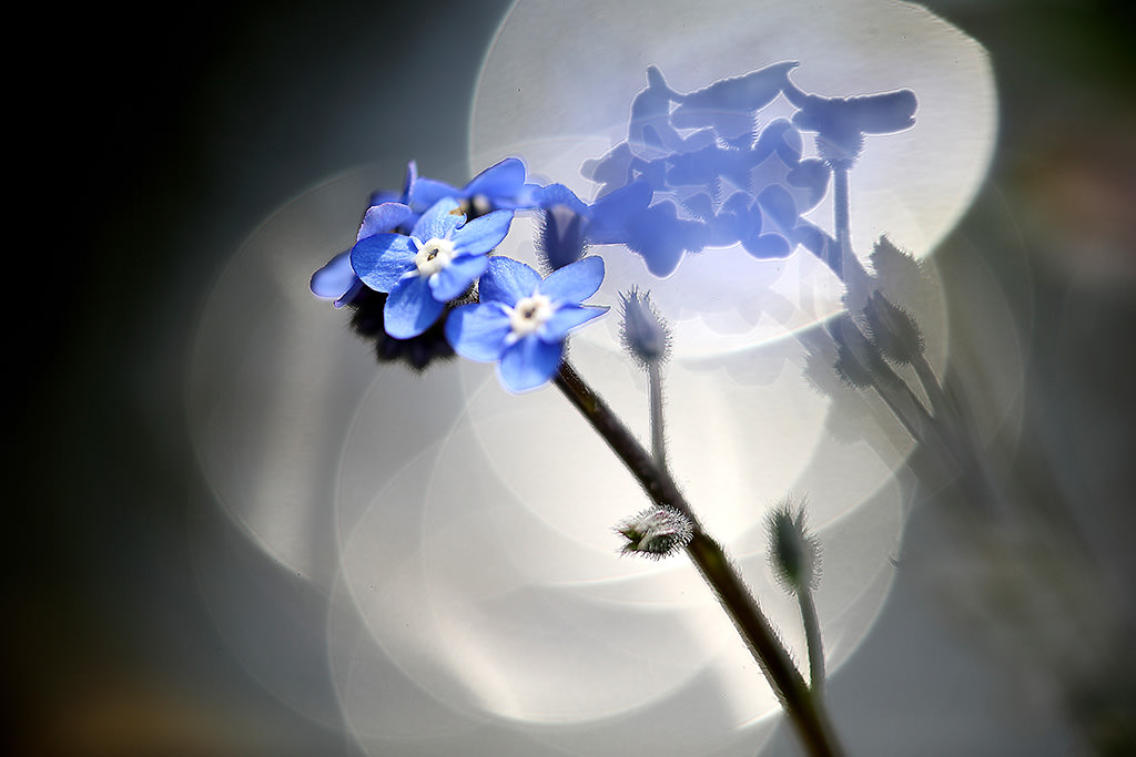 This work is inspired by forget-me-nots that flower by the water. I achieved the pattern of bokeh circles from the background light by layering several reflections on the rippled water surface, so the flower looks like it is illuminated with spotlights.