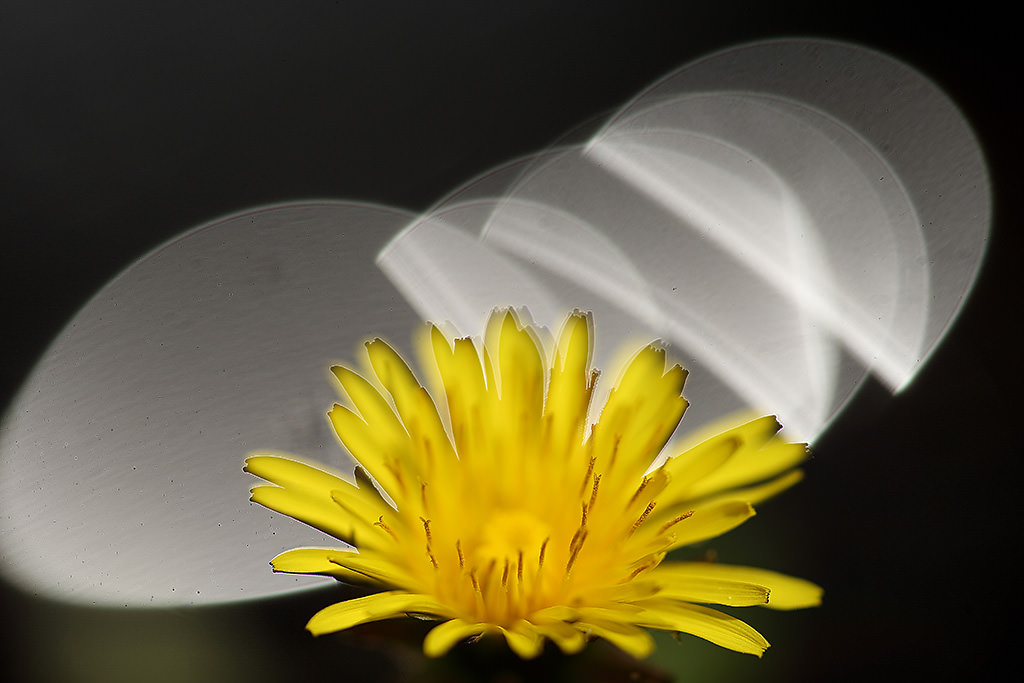 A dandelion flower near the water caught my eye, and I closed up on it with my 180mm macro lens. Instead of using multiple exposure shooting since the petals were defocused, I created bokeh circles from the reflections on the water surface in the background.