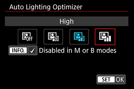 Press the Quick Control button to display the Auto Lighting Optimizer, and when you set it to "Low" or "High", the change is immediately reflected in the preview image so it is easy to see the difference between the effects in Live View.