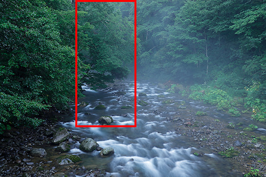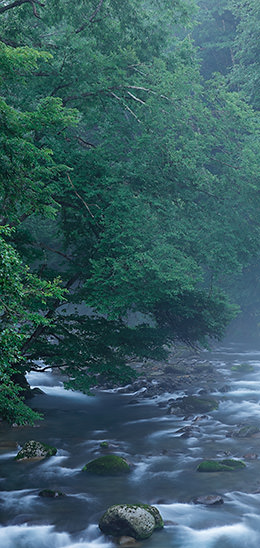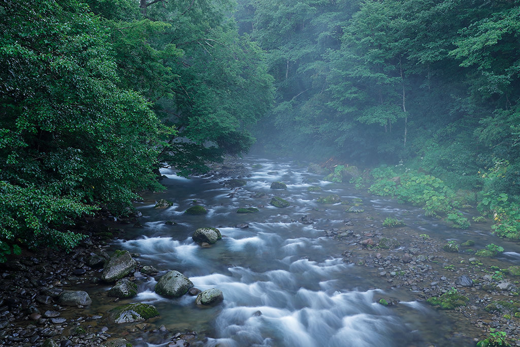 To convey the sense of humidity of a river flowing through a forest, I deliberately chose to conduct my shoot on a rainy day. This is because mist develops due to the difference in temperature between the water surface and air temperature, creating the favourable condition where the whole area is surrounded with moist air.
