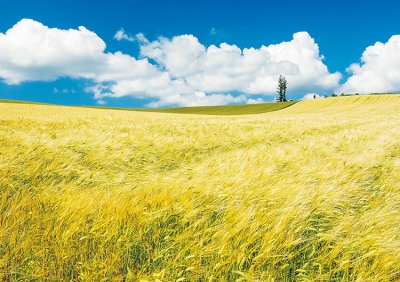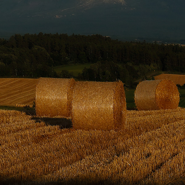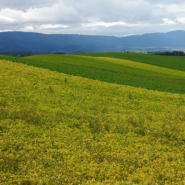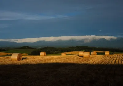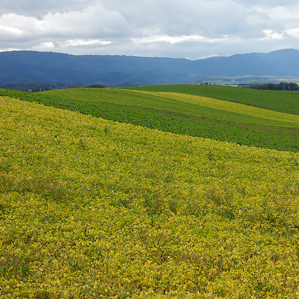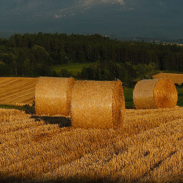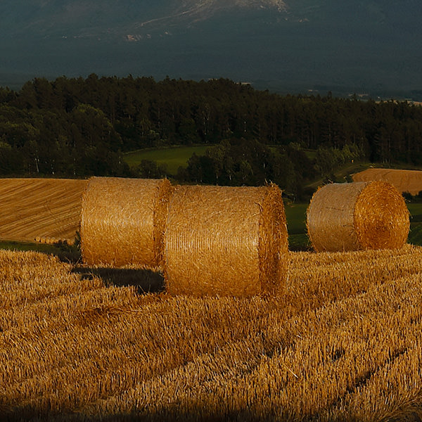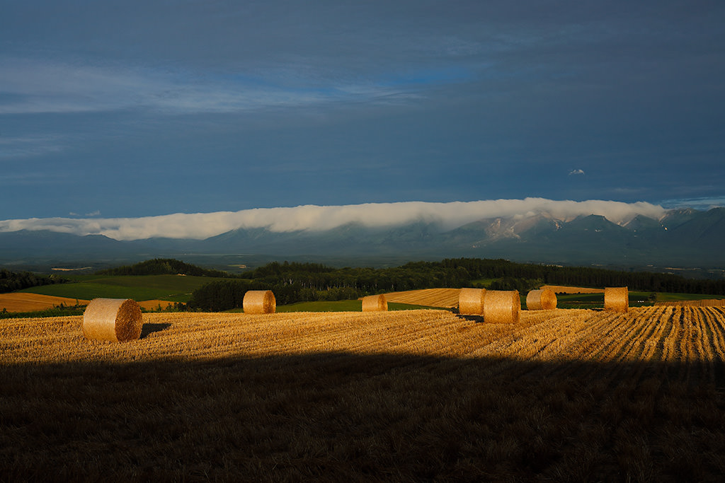 With the magnificent landscape as background, rolls of hay are placed in the field, reminding me of the summer in Hokkaido. Concluding that the low angle light in the evening would make the photo seem impressive, I waited to take the shot at the right timing.
