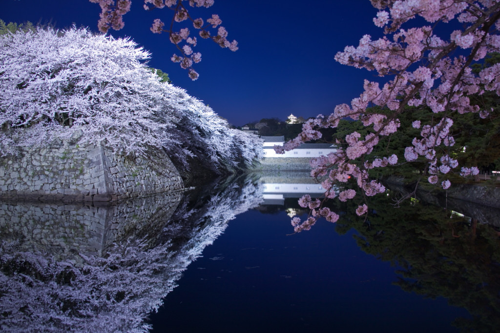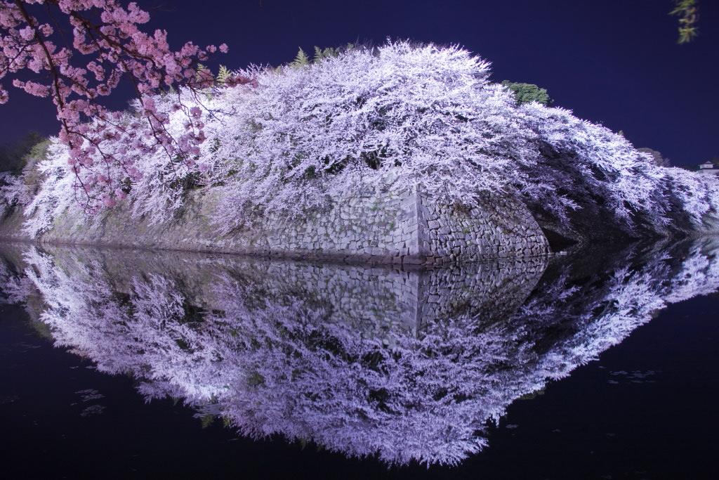 The moat around Hikone Castle is a wonderful spot for enjoying the sight of sakura in full bloom reflected on the water surface, regardless of day or night. But to capture the most impressive images of the sakura, night is best. If you want a shot where the subject and its water reflection are beautifully symmetrical, then you must ensure that there is absolutely no wind.