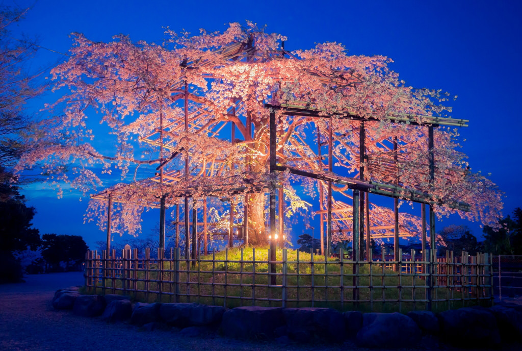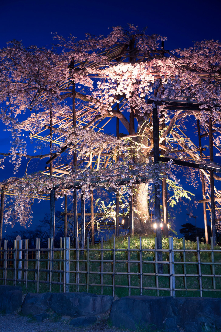This sakura appears very pale when photographed under the sun. The pale pink colour becomes more obvious only when illuminated with artificial lighting, so during post-processing, I adjusted the picture to bring out the reddish tones in the petals for more intense colour. The light source was very powerful, so I also adjusted my shooting position, making use of the pillars supporting the sakura to block off some light and soften its effect.