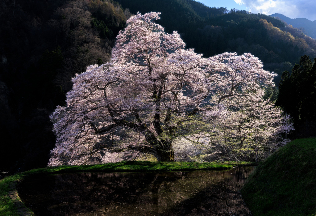 Just like the photograph of the Komatsunagi sakura tree shot by Chikako Yagi in #1, my main shot of the Inai sakura tree was taken in the evening where the light fell on just the tree, with no light on the mountain slopes. The spotlight effect helps to make the tree stand out better.