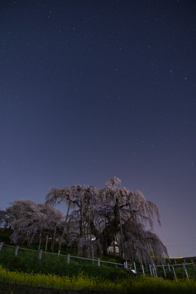 The Miharu Takizakura is lit up at night. That’s nice to see, but if you stay until after the lights go off (after 9 pm according to previous years’ schedules), you can take a beautiful photo of the tree against the starlit sky. Here, both the tree and the sky are important so I’ve created a minimalistic shot where the sky fills two-thirds of the frame. At the same time, I’ve still filled the bottom third of the frame with the tree as much as possible to keep its impact.