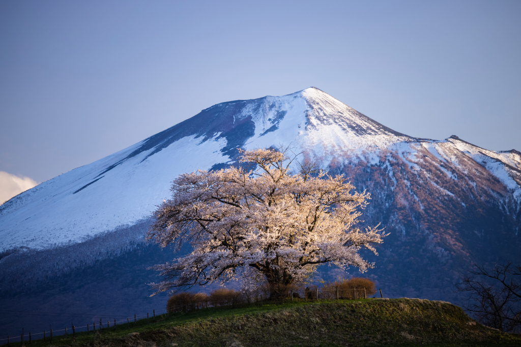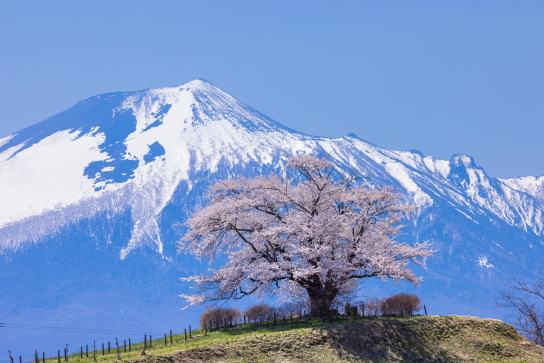 Located on top of a small hill with Mount Iwate visible behind, this tree is a popular photography spot and filming location.