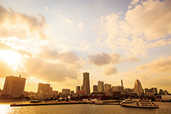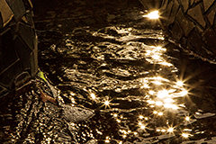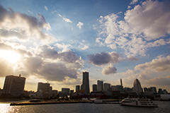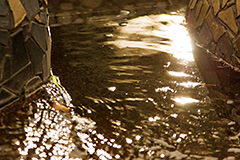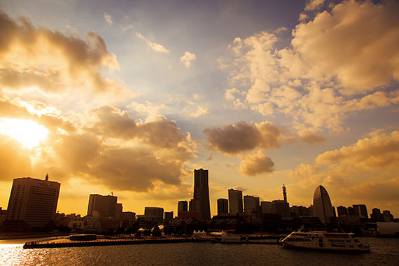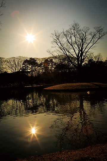 An evening with a low setting sun allows the reflected glare of the light to be captured easily on the water surface and the glass surfaces of buildings. For example, light rays are created with the glare reflected from the water’s surface to impart a glittering impression of the evening light. When shooting, keep the camera close to the ground and stop down the aperture to f/22 to shoot from the edge of the water surface.