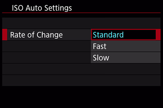When the ISO speed is set to [Auto], you can set the range of change to "Standard", "Fast" or "Slow" simply and intuitively.
