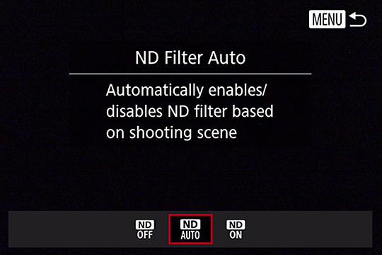 An effective ND filter has been built into the camera for times when you want to shoot with the aperture fully open or for long exposure shooting . For normal use, you should be able to set this function to Auto mode without any problems.
