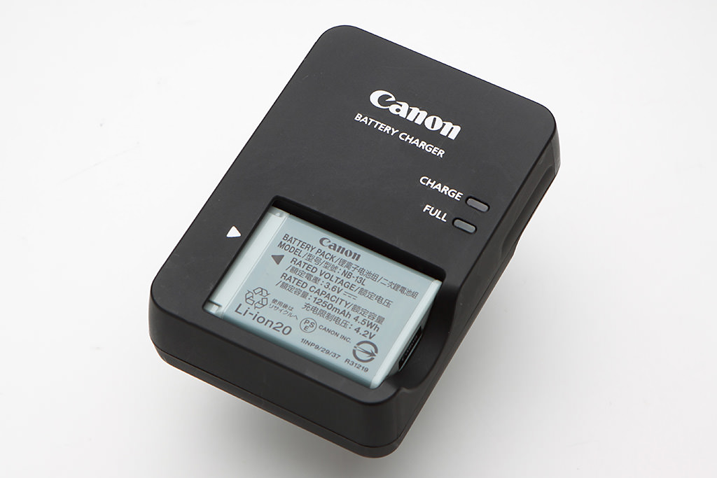 A lithium-ion NB-13L battery is used. The camera can be used for up to 265 shots from full charge. (CIPA compliant/ with LCD monitor on)